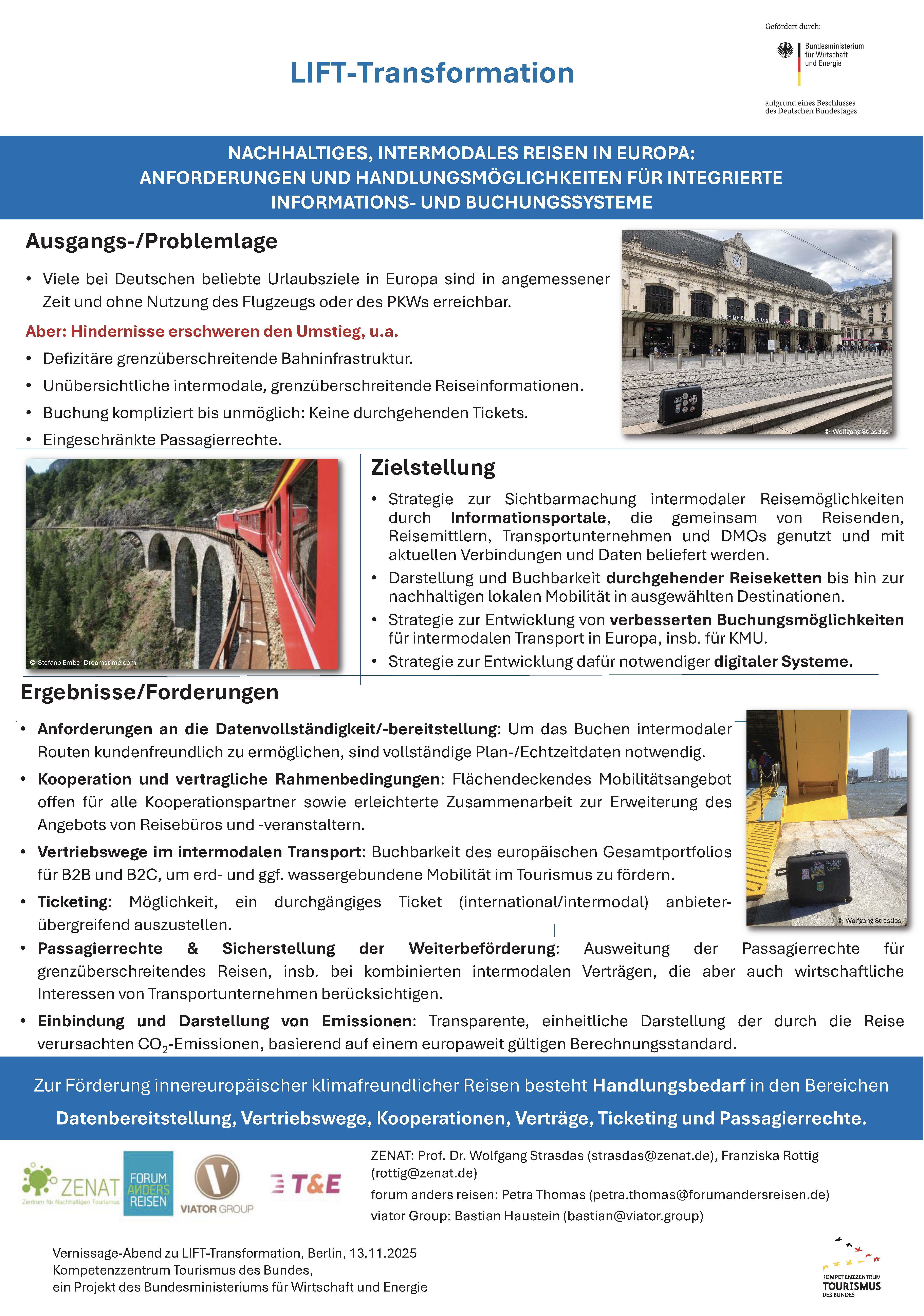 "Nachhaltiges intermodales Reisen in Europa – Anforderungen und Handlungsmöglichkeiten für integrierte Informations- und Buchungssysteme" ist ein Anschlussprojekt an LIFT Klima "Klimaschutz auf der Mittelstrecke- Flugzeug- und autofreies Reisen in Europa".
